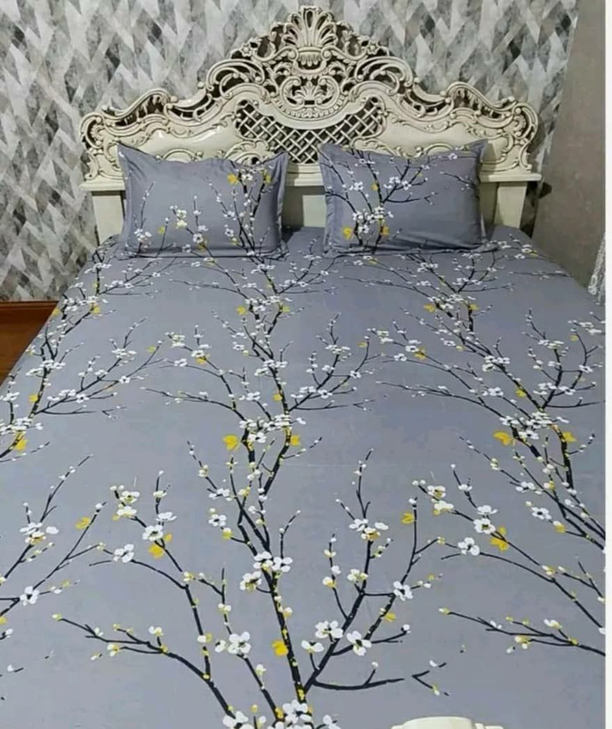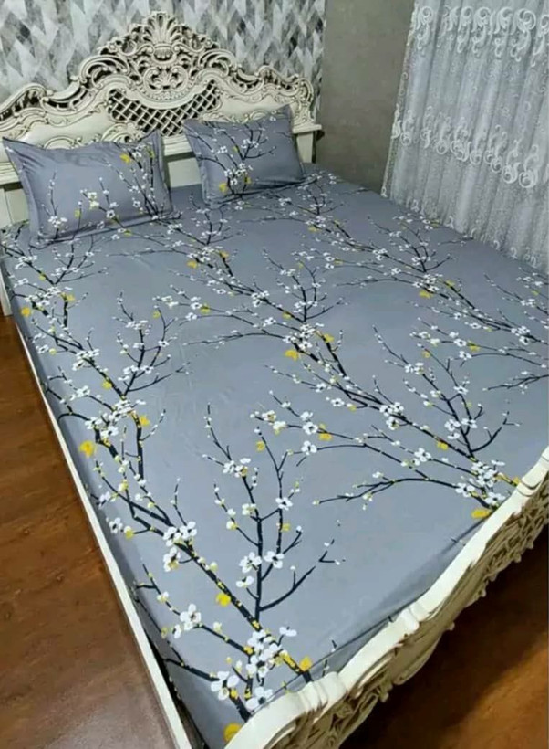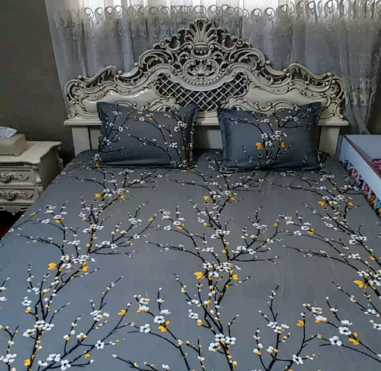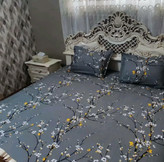 کاور تخت دو نفره طرح شکوفه های بهاری زمینه طوسی برند خوشنام هگمتان کد 300